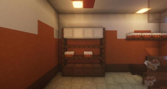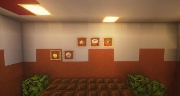 墙面的装饰史莱姆选择放上深色橡木活板门,然后放蛋糕,和在物品展示框中放入相应色系的物品。
