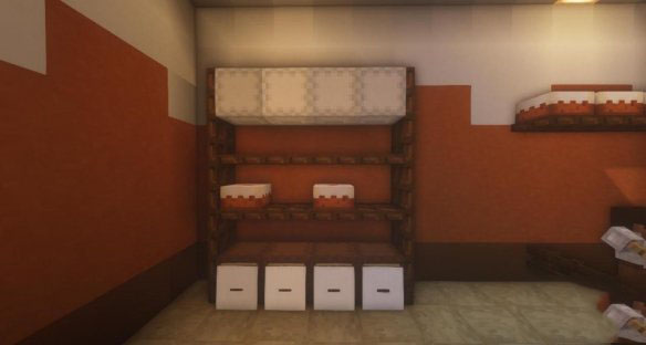 这个蛋糕架由棕色潜影盒、白色潜影盒和深色橡木活板门构成。