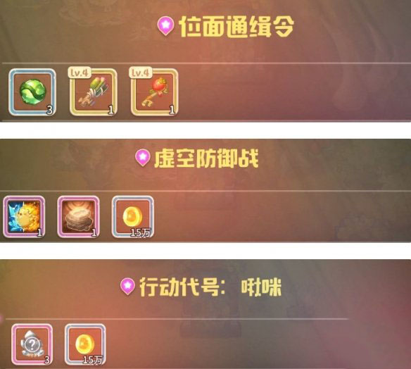 紫色难度分为三种,位面防御战、虚空通缉令和行动代号:啾咪,这几个不同任务分别会给无限宝珠和4级钥匙宝箱、SR命运卡和金币、金币和高级未鉴定宝石 。