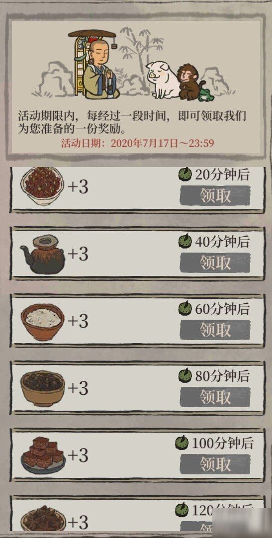 距离上次领取60分钟后,即可领取【食盐*3】。