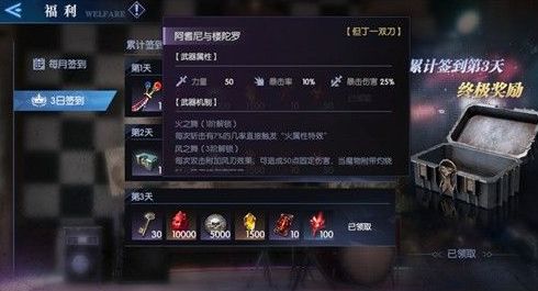 玩家们在签到到一定的次数的时候就可以获取这个签到奖励,这个签到奖励是非常的重要的,玩家们可以轻易的获取到这个签到的武器奖励,这个奖励的武器在游戏中可以说是非常的不错的。