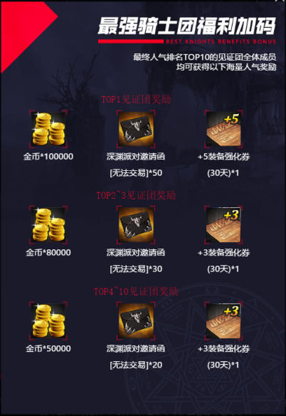 最终人气排名TOP10的见证团成员,均可获得金币、深渊派对邀请函、装备强化券等人气奖励。