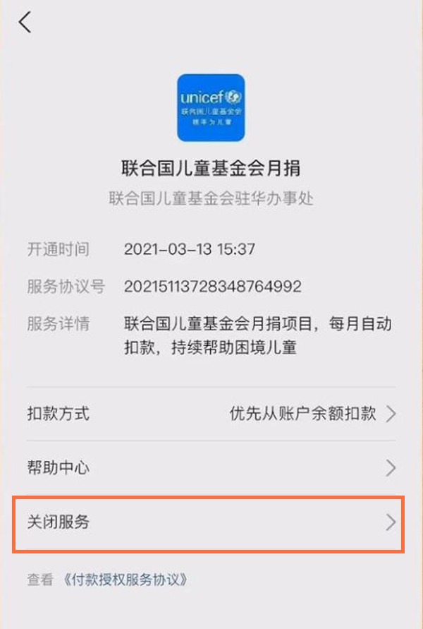 3、点击联合国儿童基金会月捐续费项目,点击【关闭服务】即可。