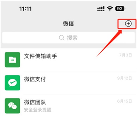 1.打开手机微信APP进入界面后,在消息列表的右上方位置点击“+”号图标。