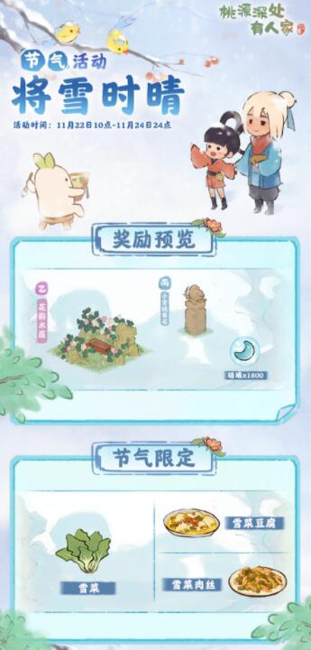山民在活动期间内,可种植特殊农作物「雪菜」和制作特殊节气菜肴「雪菜豆腐」「雪菜肉丝」,提交节气订单可以额外获得玥琅。萝萝山已准备好了本期的节气限定建筑,山民记得参与活动获取玥琅,不要错过兑换时间萝