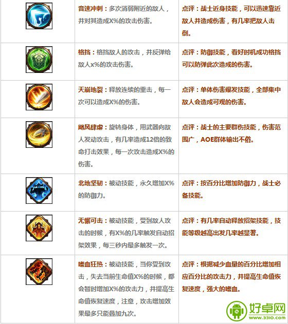 优点:血厚防高,近身爆发技能强大,充满力量的一个职业。在战场上,战士适合承担坦克的角色。他具有极高的防御力,出色的生命力和攻击力。